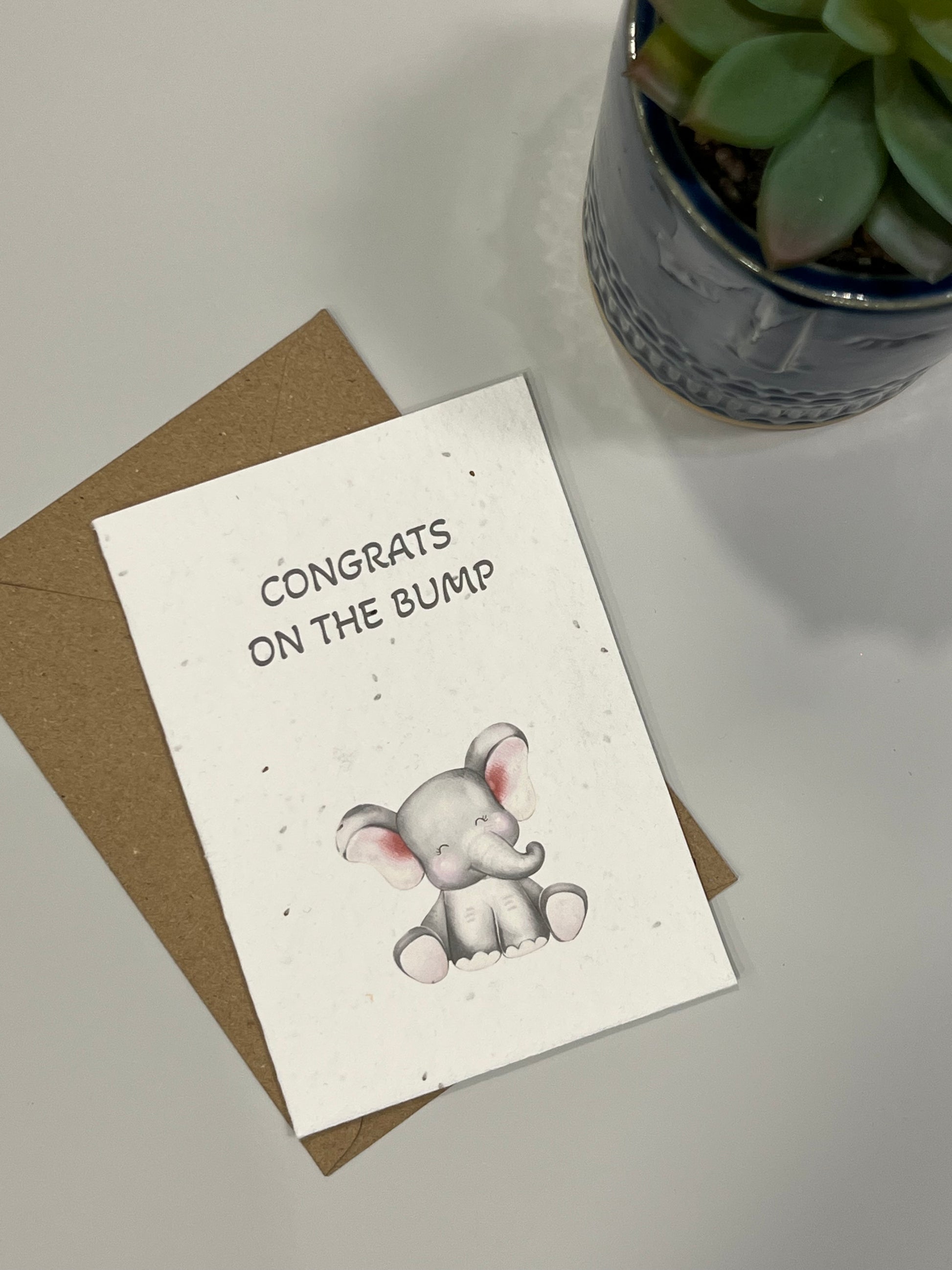 Congrats on the bump card, with an elephant design printed on seed paper. These are a great and earth-friendly alternative to standard cards.